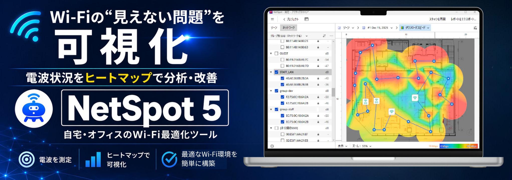 NetSpotは、周囲のWi-Fiネットワークをスキャンして電波の状況を表やグラフで表示したり、電波強度を計測することでヒートマップの作成が行える全世界で50万ユーザ以上愛用されているソフトウェアです。目に見えない電波を視覚化することで、Wi-Fi環境の改善に役立てることができます。Pro版では、これから設置予定のWi-Fiネットワークについて、電波状況を予測、計画することも可能です。 製品の詳細はこちら