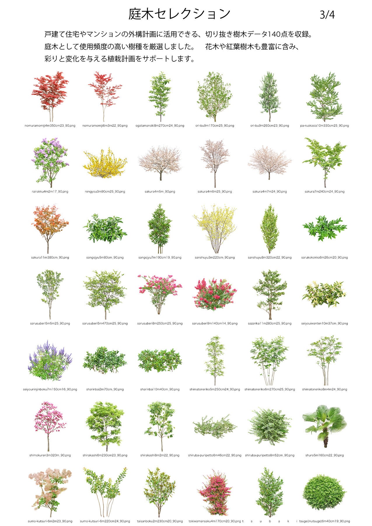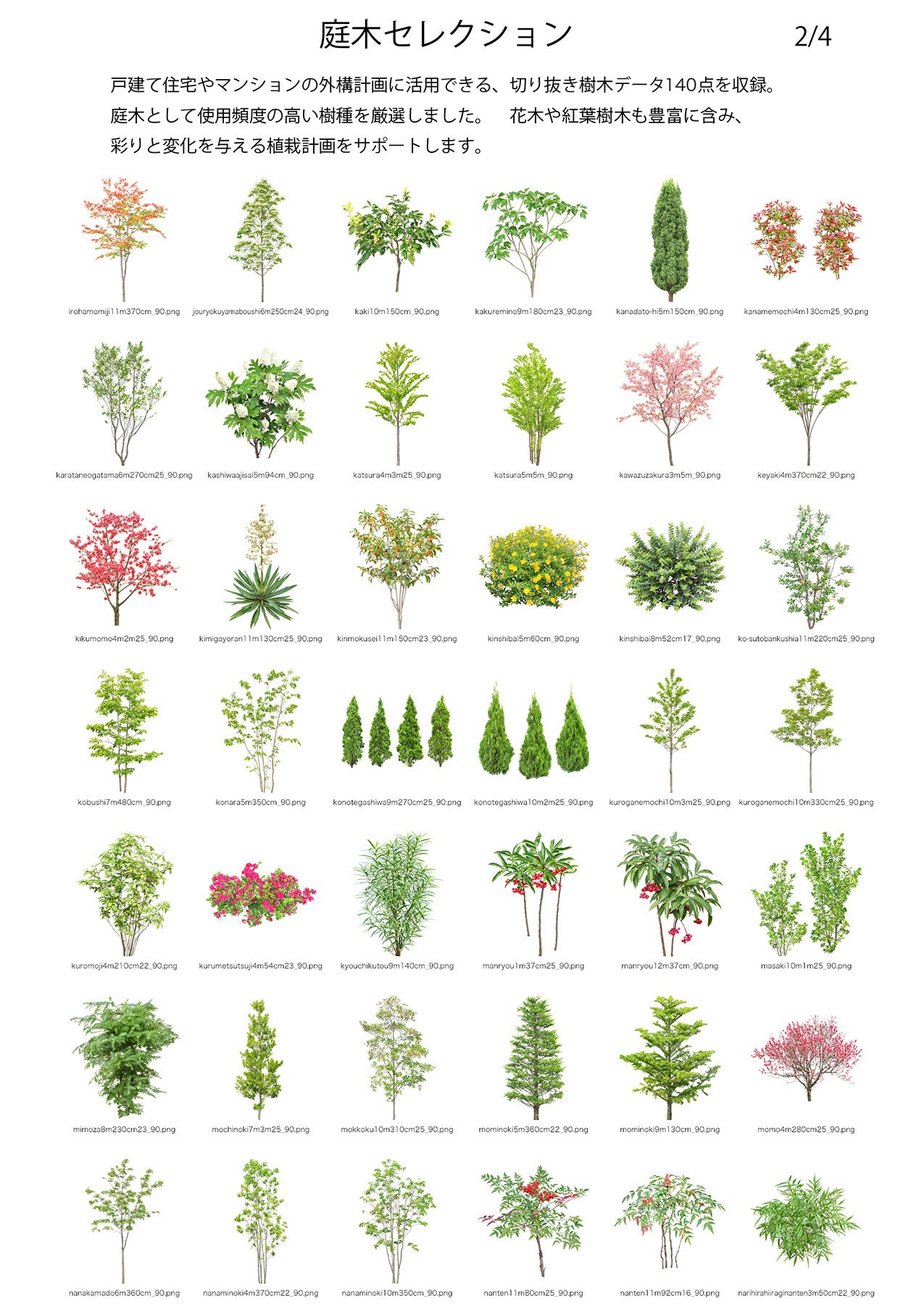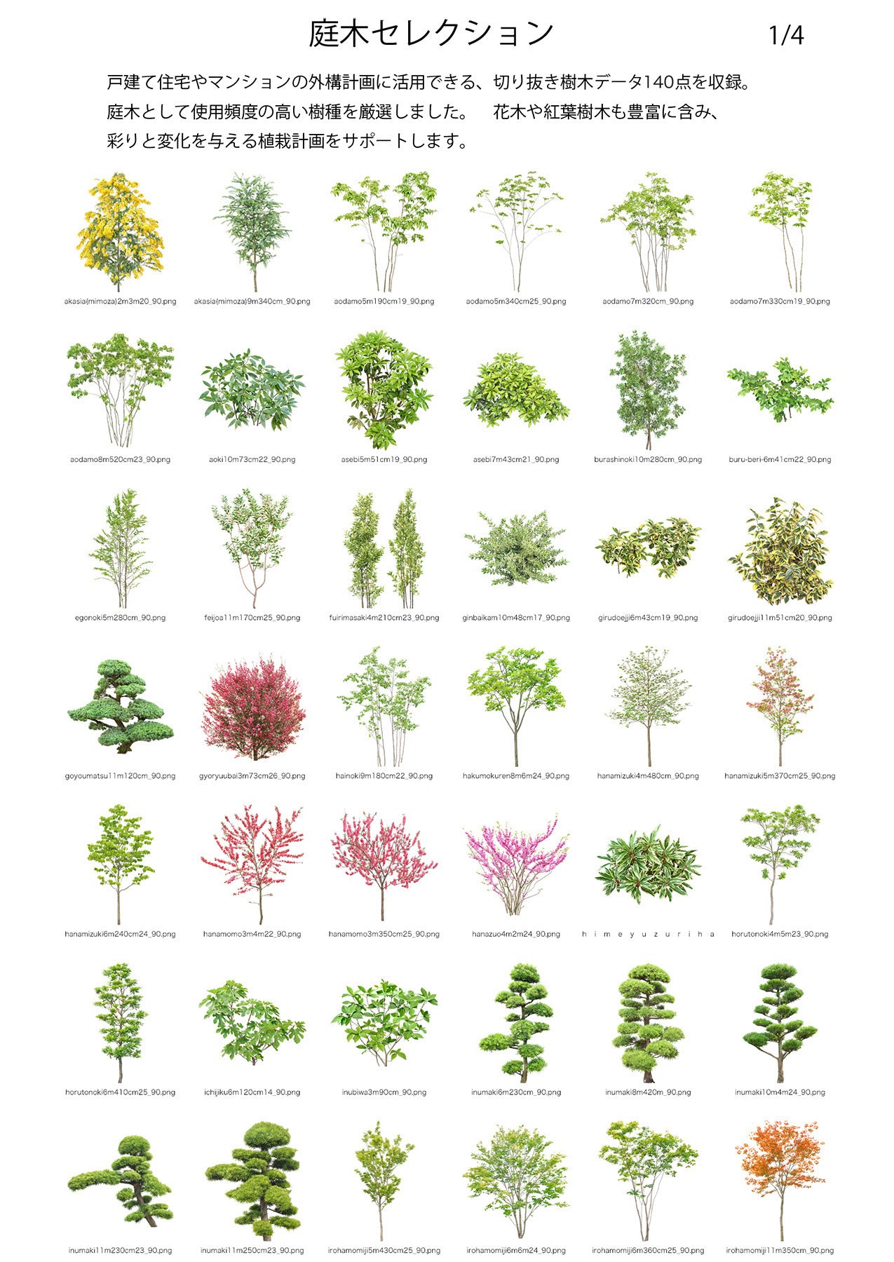 戸建て住宅やマンションの外構計画に活用できる、切り抜き樹木データ140点を収録。
